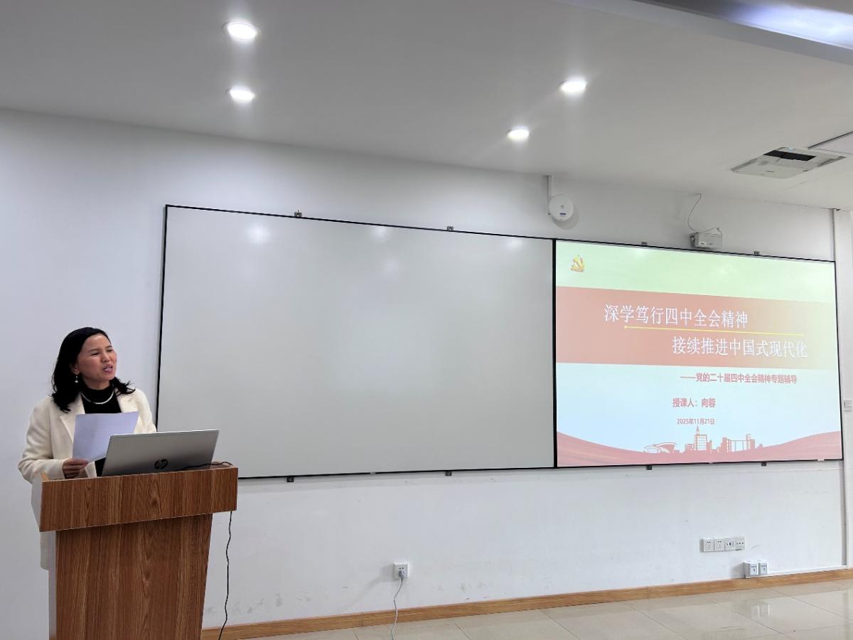 为深学笃行党的二十届四中全会精神,接续推进中国式现代化,2025年11月21日13:30,公司在博文楼4-1会议室举行秋季学期“书记专题党课”。党总支书记向蓉以《深学笃行四中全会精神,接续推进中国式现代化》为题作辅导报告,全体教职工现场聆听。