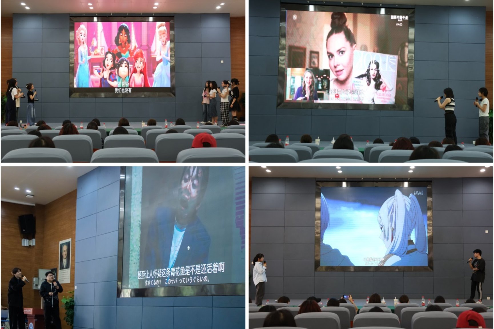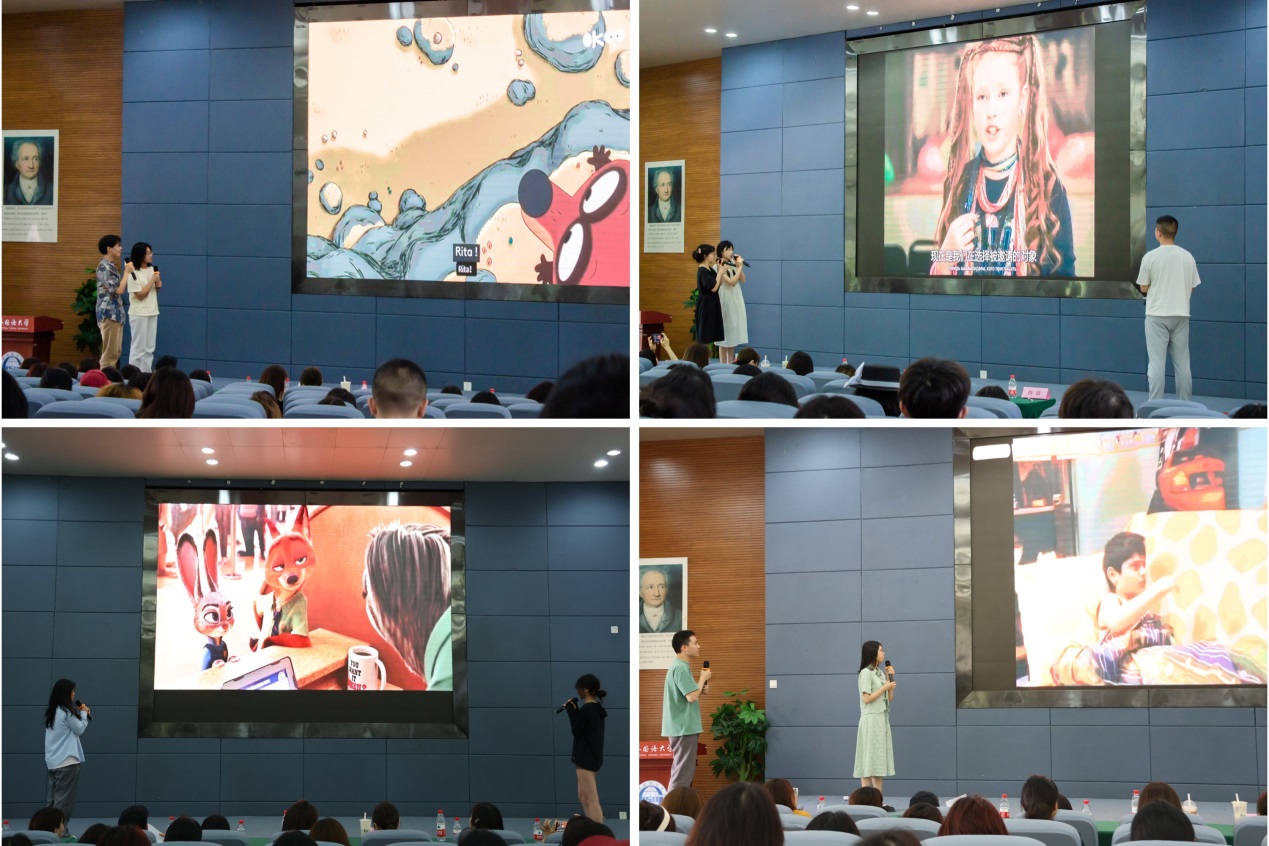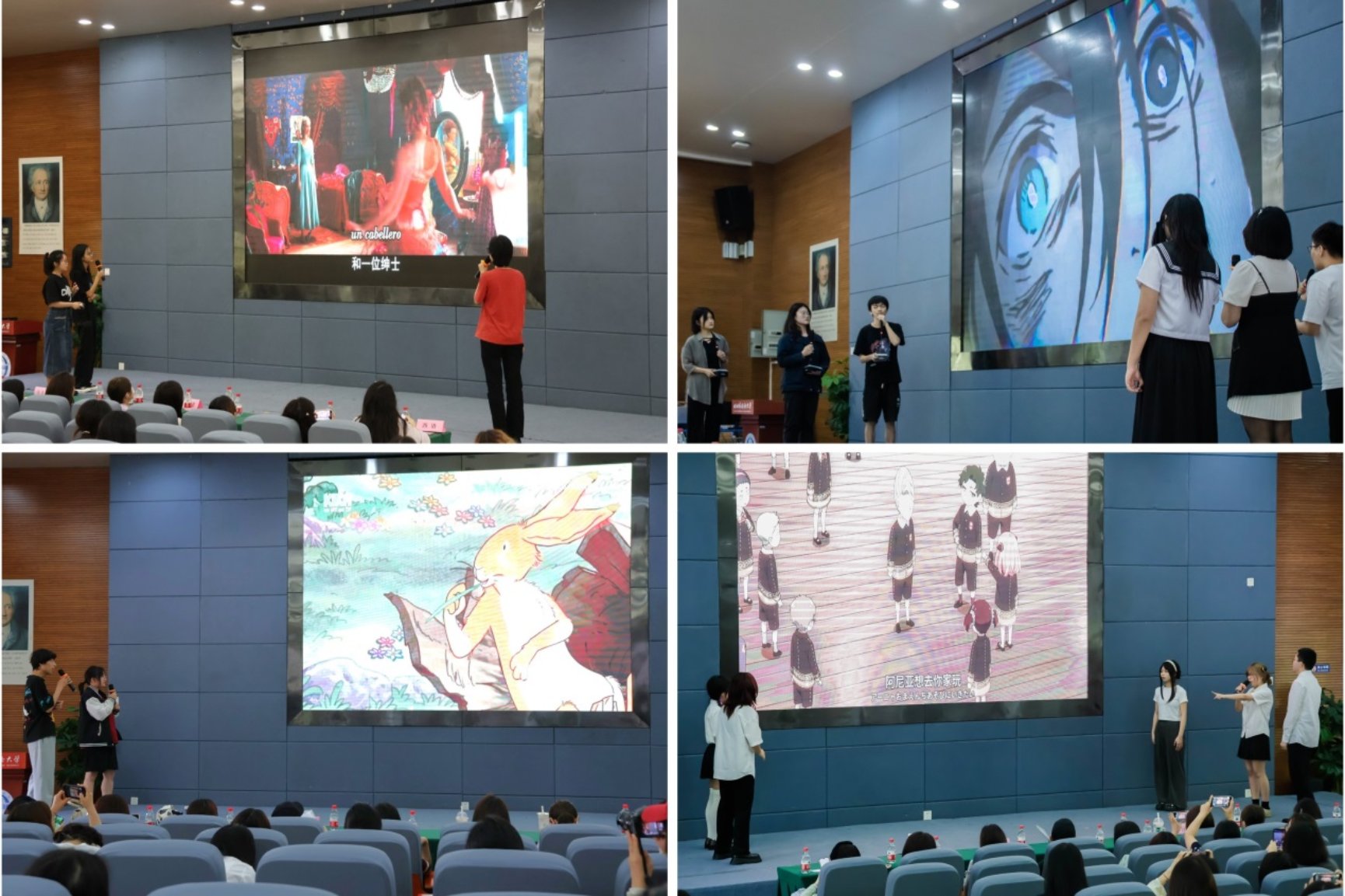 比赛现场气氛热烈,来自本科和研究生的20支参赛队伍从2400余名同员工脱颖而出,他们怀揣着对小语种的热爱和对配音艺术的热情,精心挑选了各种经典影视作品片段,用西班牙语、日语、俄语、法语、德语进行了精彩绝伦的配音演绎。 选手们凭借着出色的语言功底和精湛的表演技巧,将角色的情感和个性展现得淋漓尽致。有的选手用流利的法语为浪漫的爱情电影片段注入了新的活力,有的则用日语为紧张刺激的动作片增添了别样的风采。他们的声音仿佛具有魔力,带领着观众们走进了一个个不同的语言世界。