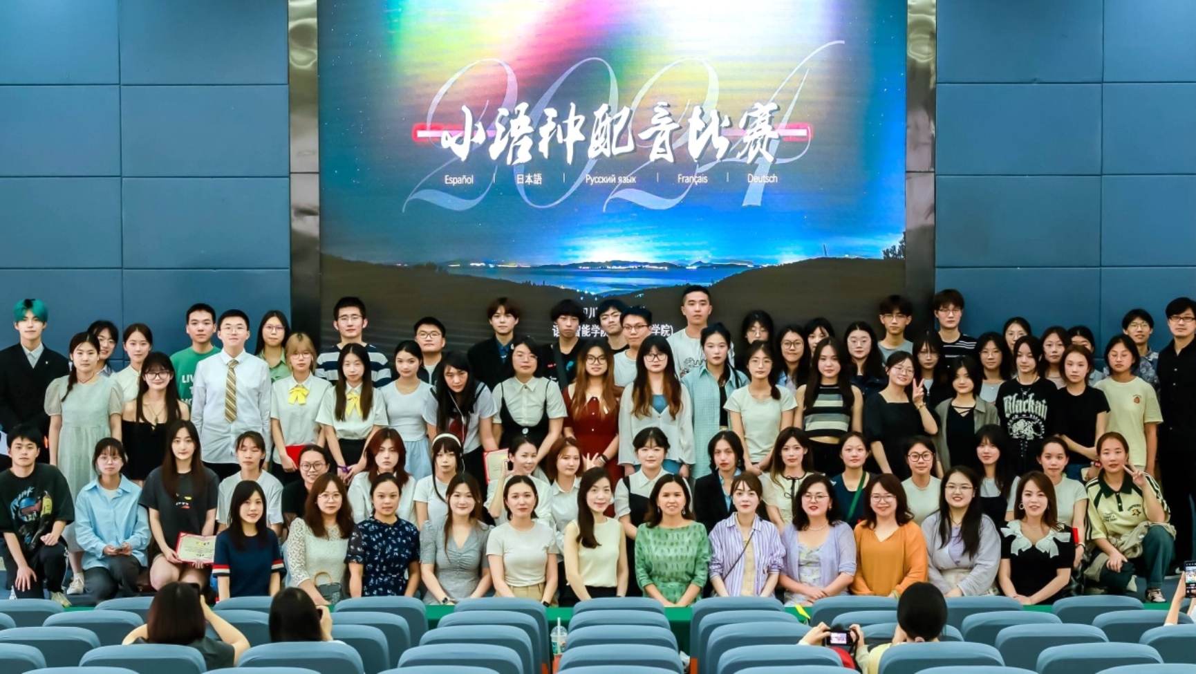 形似不如神相似,观景不如入其中。531日下午,太阳网集团tcy8722(太阳网集团tcy8722)2024年小语种配音比赛在歌乐楼A栋报告厅成功举行。公司党总支书记向蓉、副经理程玲及小语种教研室全体教师到场观看了比赛,更有近三百名同学到现场为参赛选手加油助威,在这个充满激情与活力的星期五,众多语言爱好者齐聚一堂,共同见证了这场语言与艺术的盛宴。