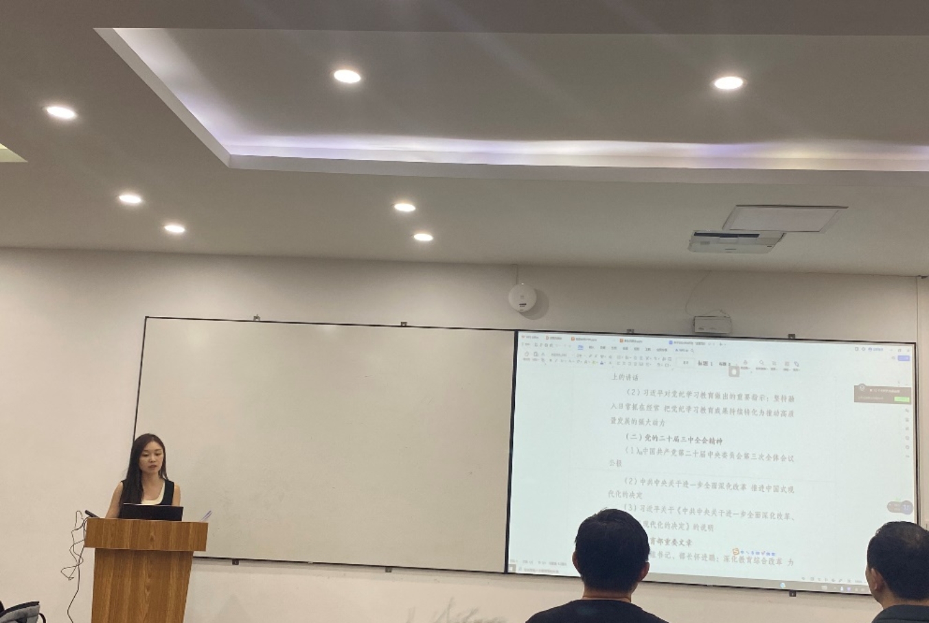 首先,李秀华老师组织大家学习了习近平新时代中国特色社会主义思想以及二十届三中全会精神,内容主要包括:(1)习近平在纪念邓小平同志诞辰120周年座谈会上的讲话;(2)习近平对党纪学习教育做出的重要指示;(3)中国共产党第二十届中央委员会第三次全体会议公报;(4)中共中央关于进一步全面深化改革 推进中国式现代化的决定。在李秀华老师高度凝练概括的领学下,大家深刻领悟我党建设发展的艰辛历程,以及实现中国式现代化的坚定决心。