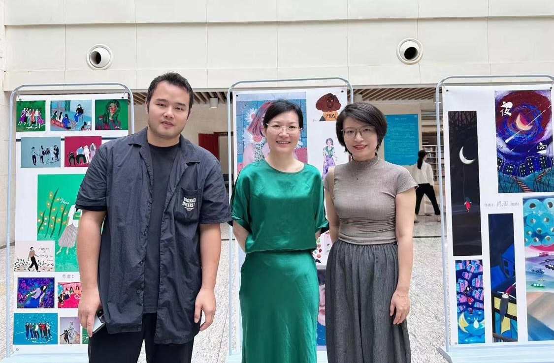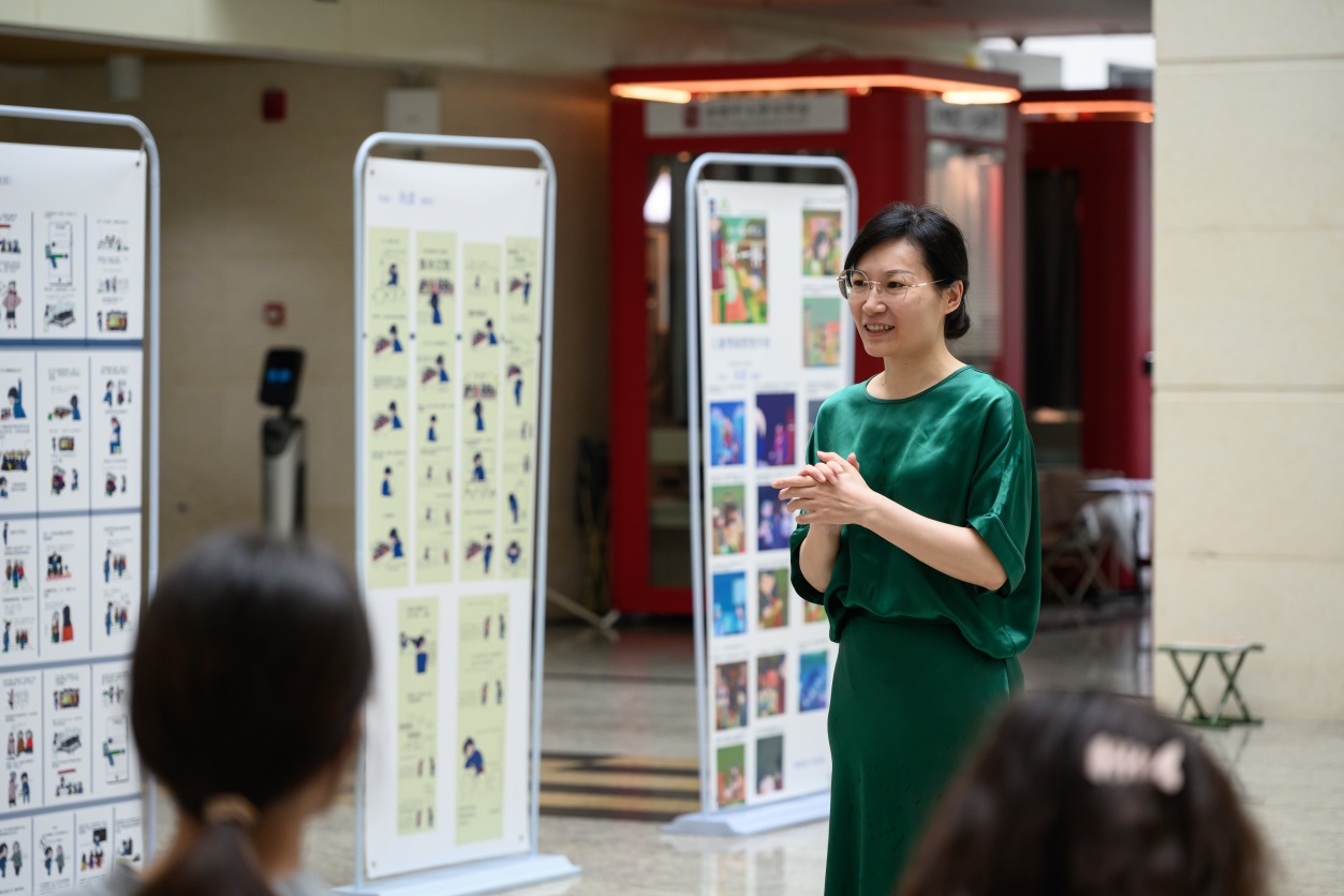 紧接着,邓晓梅上台发言。她代表国际法学与社会公司向歌乐艺术中心和图书馆表示感谢。她提到,非常感谢歌乐艺术中心为国际法学与社会公司的师生们提供了充分展现才华才能的机会,也为公司提供了在校内宣传办学成果的平台,同时也感谢图书馆为此次画展提供场地支持。接着,她从新文科理念背景下学科专业融合发展和复合应用型人才培养的角度阐述了此次画展的意义。国际法学与社会公司一直高度重视专业人才培养中的多学科知识和技能的复合融通。此次画展中相当大一部分作品为社会工作专业师生创作,利用原创数码动画作品传播倡导社会工作理念与知识也是肖彦老师一直耕耘的领域,其创作的作品和打造的新媒体平台在国内具有广泛影响力,肖彦老师将艺术学、传播学与社会工作相互融合的实践探索也得到了学界的广泛认可。在肖老师的引领和指导下,公司已有多名同学走上CG创作之路,既激发了更多潜能,也获得了自我成长。因此,此次画展既是培养员工全面发展的重要途径,也是公司新文科办学成果的充分展现。最后,她提出希望以此次合作为起点,在未来与歌乐艺术中心进一步加强合作,将CG画展打造为公司美育的一张靓丽名片。