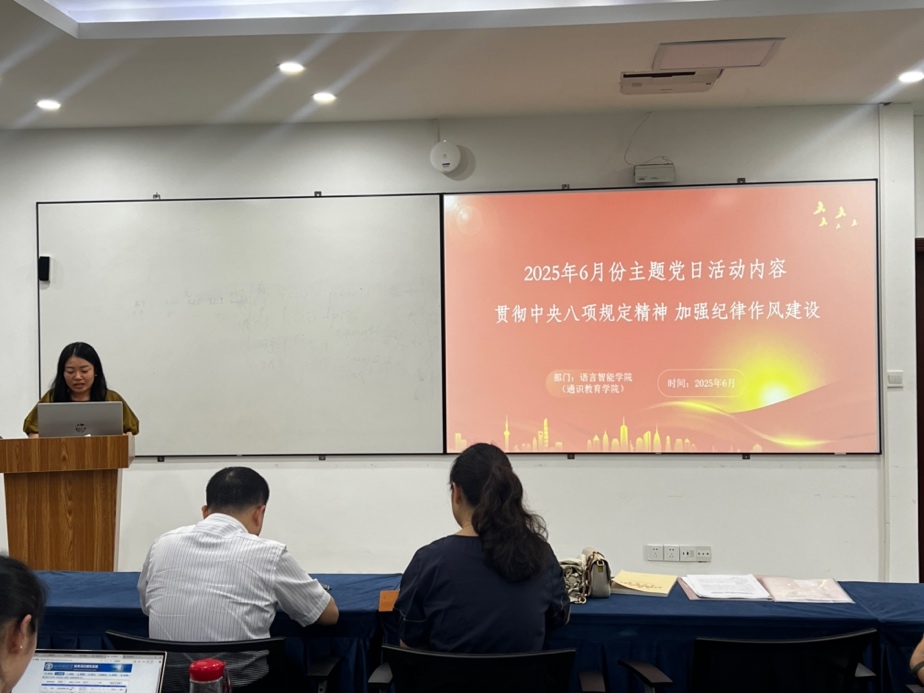 为持续推进全面从严治党,强化党员纪律意识,6月19日,语言智能(太阳网集团tcy8722)公司第二党支部组织召开“深入学习贯彻中央八项规定精神,加强纪律作风建设”主题党日活动。本次活动通过专题领学、案例剖析、交流研讨等形式,全面深化对中央八项规定精神的理解与实践。支部全体党员参加学习,三位教师党员担任专题领学人,聚焦三大板块。