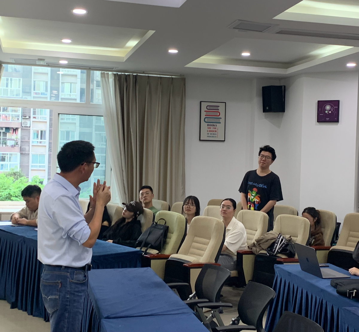 在讨论环节中,程老师和卢同学与在座师生进行了深入的互动交流。程老师回答了员工们关于文献阅读、如何了解学术前沿研究等方面的问题,并分享了文献泛读的方式,如通过关键词检索、方法梳理等方法帮助同学们有效提升文章阅读速度。卢同学则分享了如何找到自己兴趣点所在的方法,她建议在基于语言学理论的基础上,广泛阅读,不断探索和尝试。