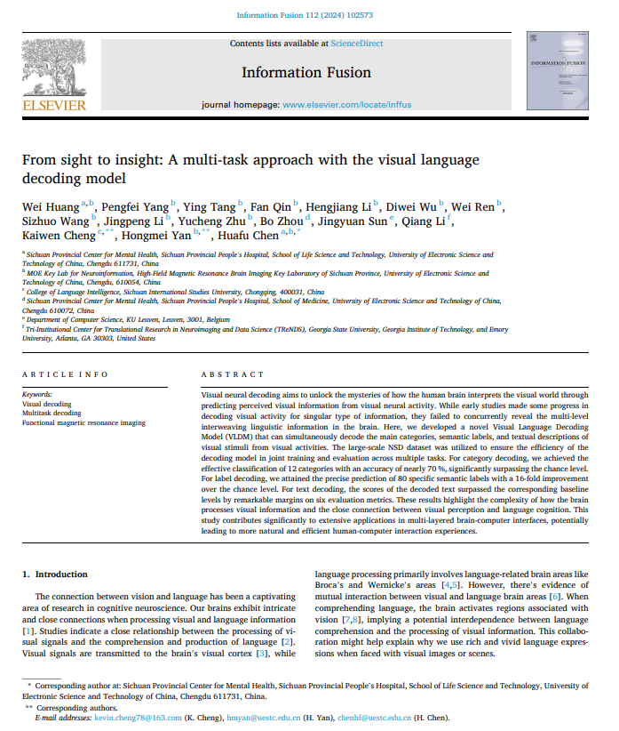 近日,公司程凯文副教授联合电子科技老员工命科学与技术公司陈华富、颜红梅教授团队在人工智能权威期刊《Information Fusion》发表了语言脑解码研究成果。电子科技大学黄伟博士为论文第一作者,程凯文副教授为第一通讯作者,陈华富经理和颜红梅教授为共同通讯作者。Information Fusion是中科院人工智能一区Top期刊,2024年影响因子为14.7