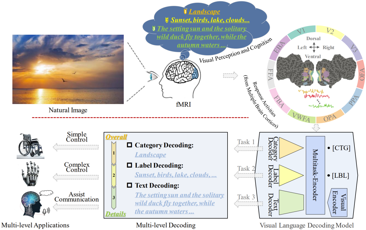 语言脑解码一直是认知神经科学中一个引人入胜的研究领域。有证据表明在理解语言时,大脑会激活与视觉相关的区域。这种互动可能有助于解释为什么我们在观看图片或美景时使用丰富而生动的语言表达,如图1。在这项研究中,我们开发了一种新型的视觉语言解码模型(VLDM),包含两个编码器(Visual-EncoderMultitask-Encoder)和三个解码器(Category-DecoderLabel-DecoderText-Decoder)(如图2所示),能够从大脑核磁共振信号(FMRI)中解码刺激图像的主要类别(如,风景画)、多语义标签(如,落日、鸟儿、湖水,以及云彩)以及详细文本描述信息(如,“天空中绚丽多彩的云朵”或“落日余晖映照下的湖水”或“落霞与孤鹜齐飞,秋水共长天一色”)。在类别解码任务中,我们在自然图像的12个主要类别上(人、车辆、户外、动物、配件、运动、厨房、食物、家具、电子、电器和室内)实现了有效解码,准确率接近70%,显著超过随机水平(8.33%)。在语义解码任务中,我们精确解码了80个详细的语义标签(如汽车坐着等),准确率达到20%,比随机水平(0.0125)提高了16倍。在文本解码任务中,解码文本(如“一个男人在网球场上挥动球拍”)在六个评价指标——BLEUCIDErROUGEWCSGCSFTCS上超过了相应的基线水平,实现了35%36%32%28%6%3%的性能提升。